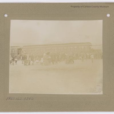 Update 3/2010: Sepia print. Snapshot. Mounted on tan matboard with a patterned border and two binding holes in top edge. 1951.162.0347 mounted on back. Image of a large crowd of people on the dirt lot next to a passenger train. A large group of soldiers appear to be boarding the train. Hills and flag in background.