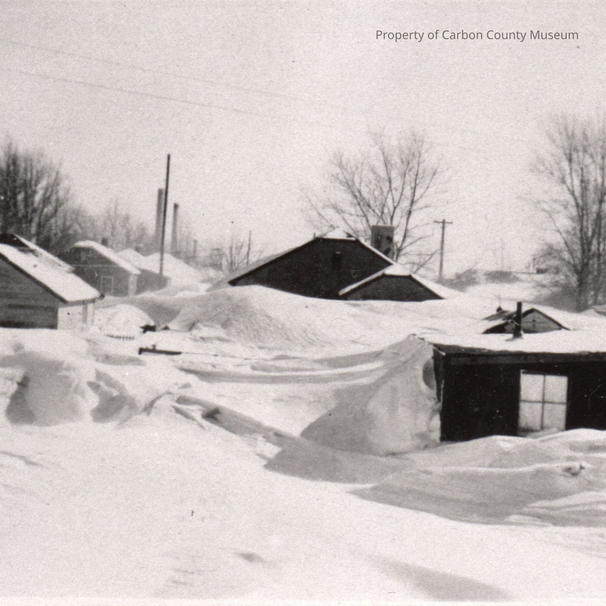 Black and white copy print. Image of buildings under huge drifts of snow. Trees in background. Blizzard of 1949.