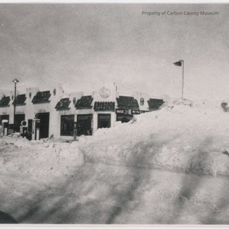 Black and white copy print. Image of large building with large snow drifts all around. Appears to be a gas station.