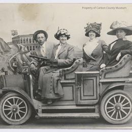 Update 1/2008: Black and white print. Studio pose. Image of three women and one man in a prop automobile with painted scenery backdrop. Women are in long dresses and fancy hats-one behind the wheel and two in the back seat. Man is sitting next to the driver and is wearing a light suite, white shirt, light tie and hat.