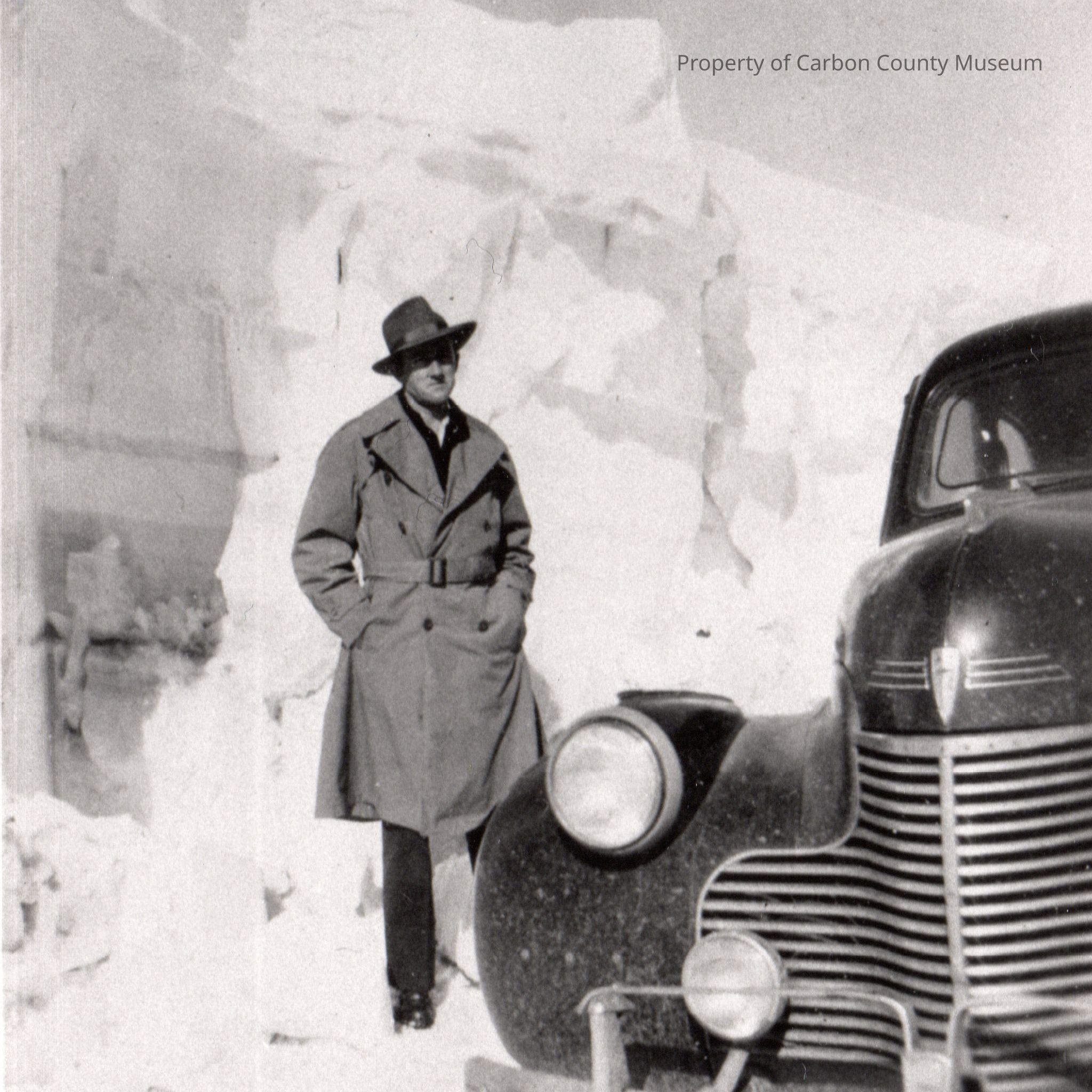 Black and white copy print. Image of a man and automobile posed in front of a snow drift digging out a road. Drift is higher by feet than the man's head. Man is dressed in shirt, top coat, hat. His hands are in his coat pockets.
