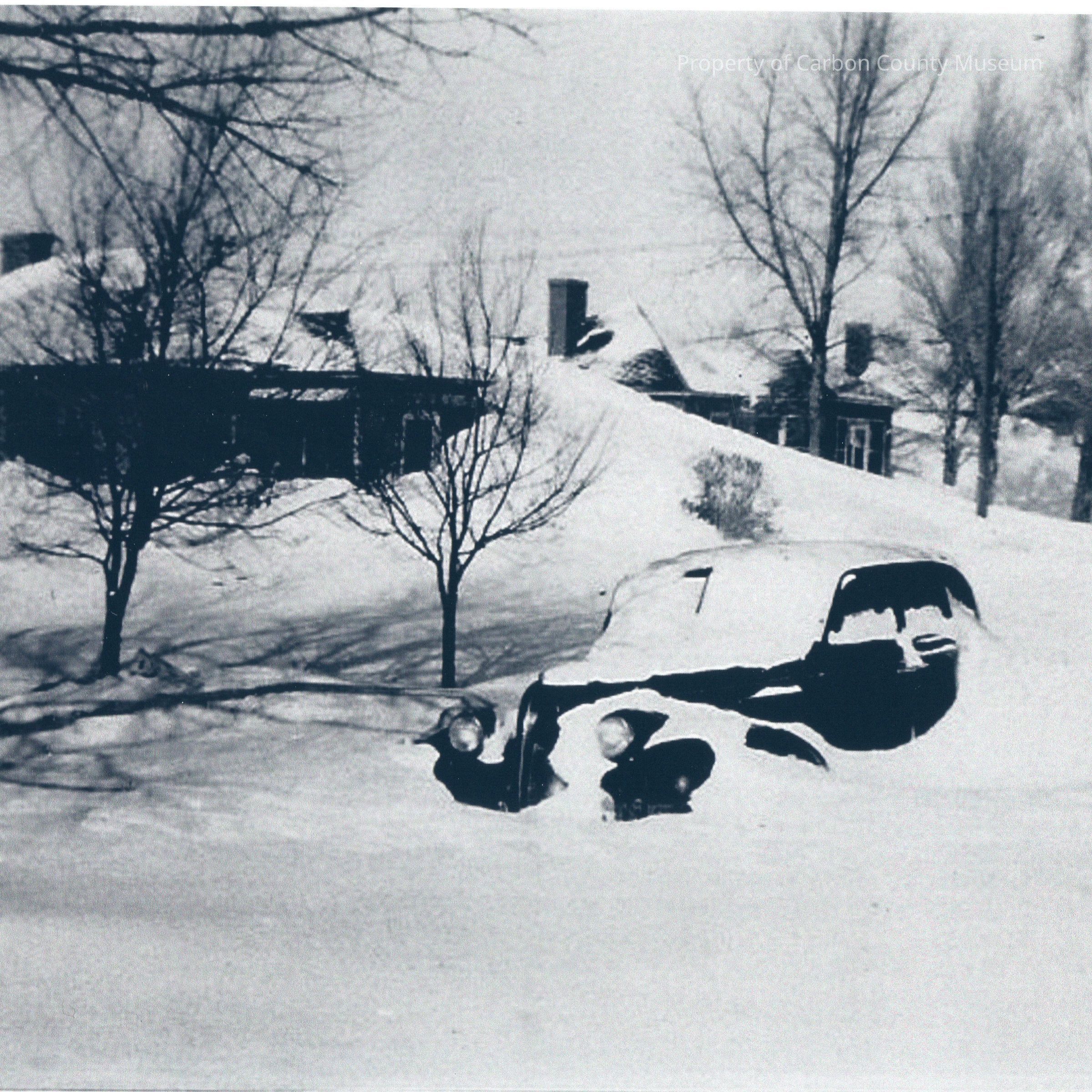 Black and white copy print. Image of a residential neighborhood, trees and automobile buried in high snow drifts.