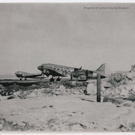 Black and white print. Image of two planes on a cleared runway. Deep snow and posts in foreground. Truck is backed up to closest plane loading cargo into plane. Blizzard of 1949.