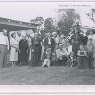 Black & white print. Snapshot. Image of a large group of people - family reunion? posed on a lawn. Structures & trees in background.
