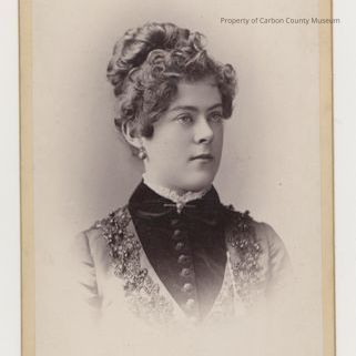 Update - 2009: Black & white print. Studio portrait. Mounted on tan matboard with gilt edges. Head & shoulders portrait of a woman dressed in two-tone dress & jacket. Yolk & collar dark velvet(?) with 7-8 large round buttons down center front. Top of collar on blouse with ruffed edge. Shoulders, sleeves & bodice lighter material - embroidered & beaded decoration over shoulders & down front. Crocheted or tatted decoration pinned to her left breast. She is wearing round dangle earrings. Her curled hair is pinned up.