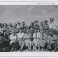 Black & white print. Snapshot. Image of a large group of men and women seated & standing, on a dirt open area; hills in background.