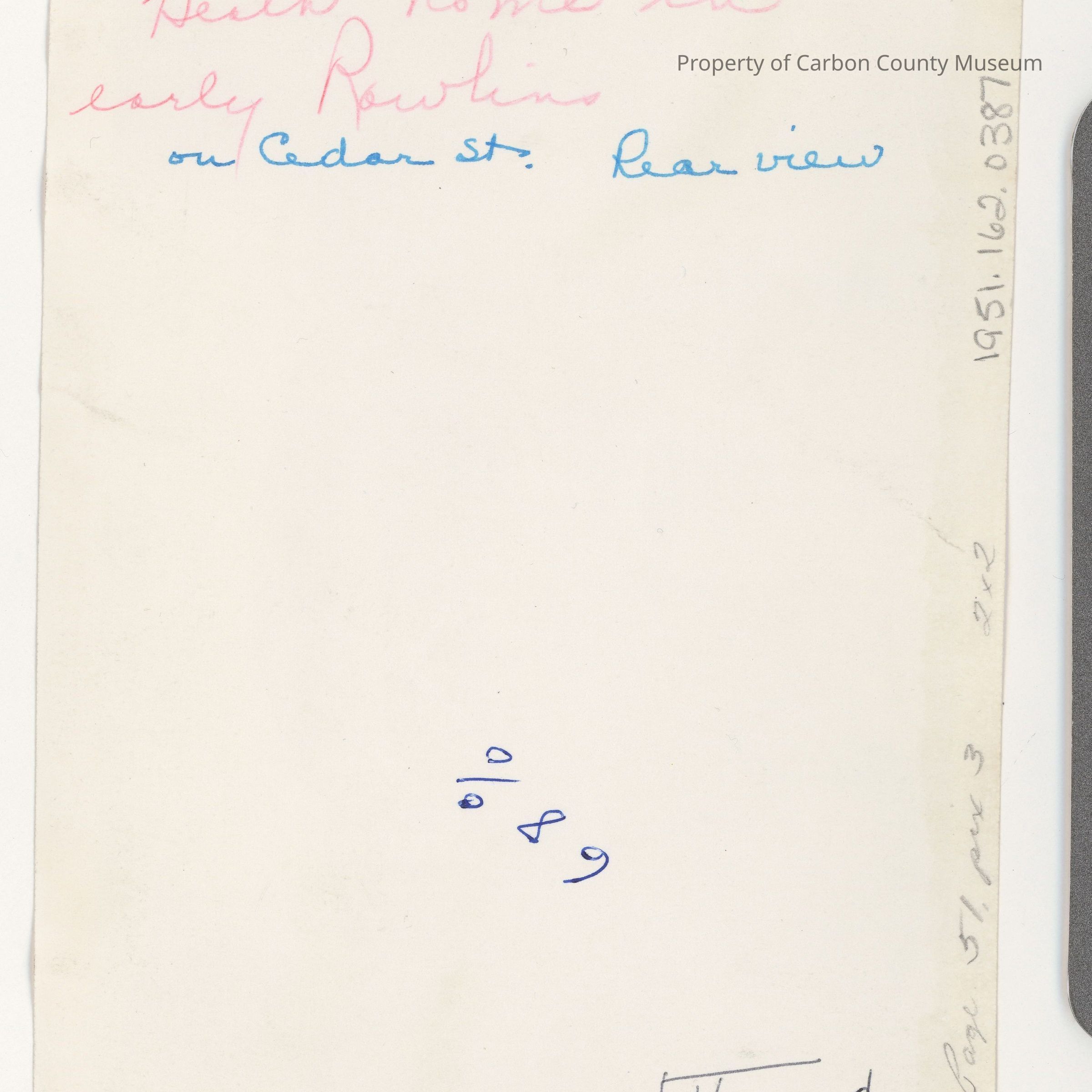 Update 2009: Black and white glossy print of a two story log house with an attached smaller single story building. Barren ground is seen in foreground of print, and other buildings in background with large hill in distance. Three tall pipe chimneys (2 on large house and 1 on smaller attached house) are seen.