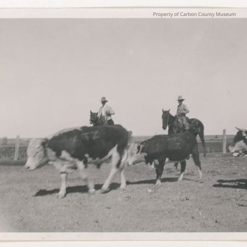 Black & white print. Snapshot. Image of two men on horseback herding cows with "T2" brand. Fence & prairie in background.