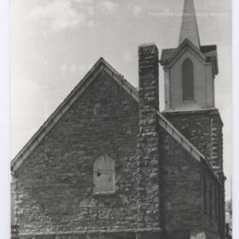 Black and white print. Image of a stone building with a stone and wood tower and steeple. Side of building facing camera has a steep pitched roof and stone chimney and single arched window. Tower is in background-two stories of stone, third of wood with arched louvered window and pitched roof on each side. Wood steeple rising from center of roof. Dirt road or yard in foreground.
