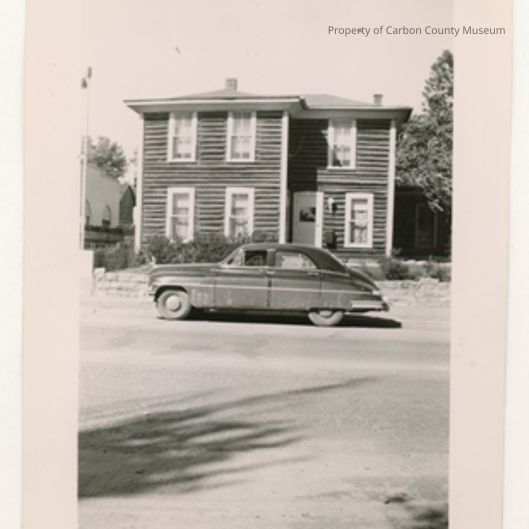 Update 2009: Black and white print of a dark two story log house with white trim around windows and corners. Shrubs are seen at base of house and trees are seen at side right. A four door black coupe car is parked in front of house in street.
