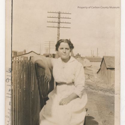 Update 2009: Fade black an white print, printed on postcard paper. A woman seated on a wooden chair alongside a wooden picket fence. Three tall telephone poles behind her and several small houses and shacks. The woman's hair is pinned up and she is wearing a belted light colored dress. Along the left border is written: "July 11, 1916" in pencil.
