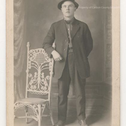 Update - 2009: Faded black & white print. Printed on postcard paper. One young male standing with his right arm slung over the back of a light colored chair. Behind him is a painted backdrop from a photography studio. The young man is wearing a dark suit, buttonup shirt, & a bow tie. He is wearing a hat & dress shoes or boots. The chair next to him is light colored with a lot of scroll detail.