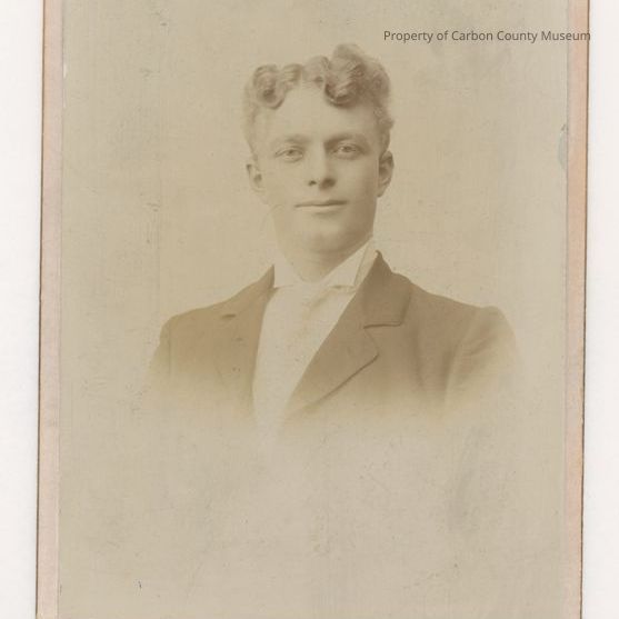 Update 2009: Black and white studio portrait print attached to a cream colored mat which has "Brown Rawlins Wyo" and tiny decorative blue green border print on lower edge. Print shows Lou J. Nelson wearing a dark suit jacket, with shirt with high neck stick collar and light colored tie. He has extremely curled hair on top and parted side right of center. He appears to have light colored eyes.