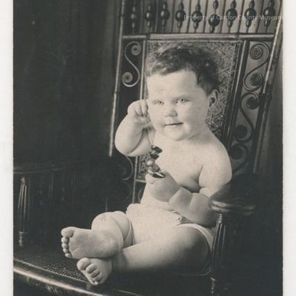 Update - 2009: Black & white print. Printed on postcard paper. Photo of a female baby sitting in a wooden chair. The child has short, dark curly hair. She is pulling on her right ear with her right hand. In her left hand she is holding a rattle or a toy. She is wearing nothing but a diaper. The chair she is sitting in is decorative with scroll hook and beads.
