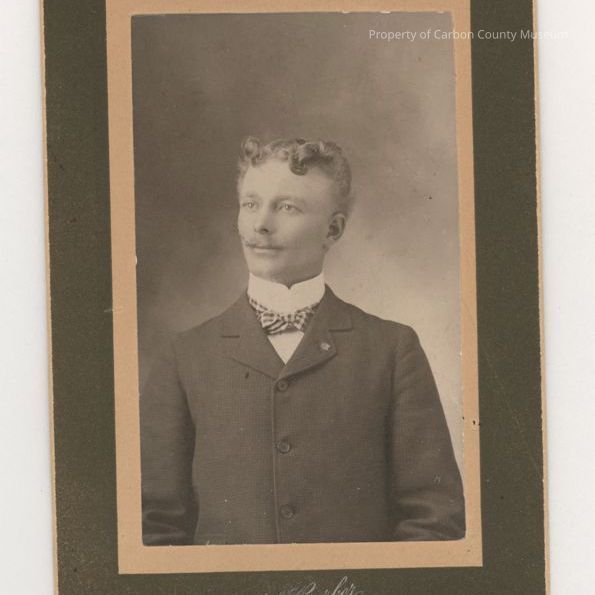 Update 2009: Black and white studio portrait print attached to dark gray mat with "Weyle & Barber Laramie & Rawlins, Wyoming" engraved in lower edge of mat. print is of Lou J. Nelson as a young man. he is wearing a dark suit jacket with white shirt with high stiff collar with a gingham looking bowtie. His hair is extremely curly on top. He has a small mustache. There is a small lapel pin on side left lapel of jacket.