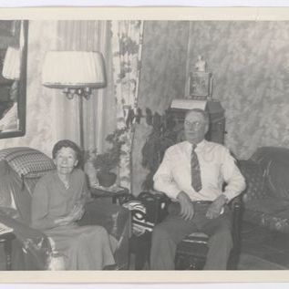 Update 2009: Black and white print of Lillian and Lou Nelson each sitting in an easy chair in their livingroom. Leafy wallpaper is seen in background. Window in background center has a sheer long curtain with a floral printed drape on side right. A mirror is on side left wall. Lillian's dark hair is short and she is wearing a medium dark dress. Lou is wearing medium color trousers, white shirt and patterned tie. He has a graying mustache and short hair . A dark sofa is on side right.