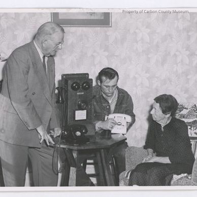 Update 2009: Black and white glossy print of Lou and Lillian Nelson looking at different types of telephones on a small table. Lou is dressed in medium suit with white shirt and tie, standing and resting his hands on the table. A service man dressed in jean jacket, shirt and jeans is kneeling behind table an demonstrating a light colored dial phone. A tall wooden wall and dark phone is to left of young man on table and a black table console phone is on table in front of crank phone. Lillian Heath Nelson is sitting in an upholstered chair with a striped towel over it and a tapestry decorated with a winter scene with horses is draped across chair top. Leafy wall paper decorates wall in background .Lillian is wearing a dark dotted swiss dress with broach at neck V. Her dark hair is short and her hands are clasped together in her lap. She is looking to the right toward the table with the phones.