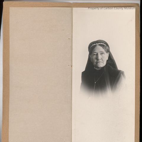 Update 2009: Black and white studio portrait print attached to a tan textured heavy paper bifold booklet type holder A piece of tissue covers the print (like a cover page). Print shows an older woman with dark hair pulled back and covered with a dark mourning hat and fabric train draping down her back. The front portion of the hat has tiny lace decoration as does neck edge of dark bodice of dress. A small long chain is held together at middle front bodice and drapes in long double line down bodice front.