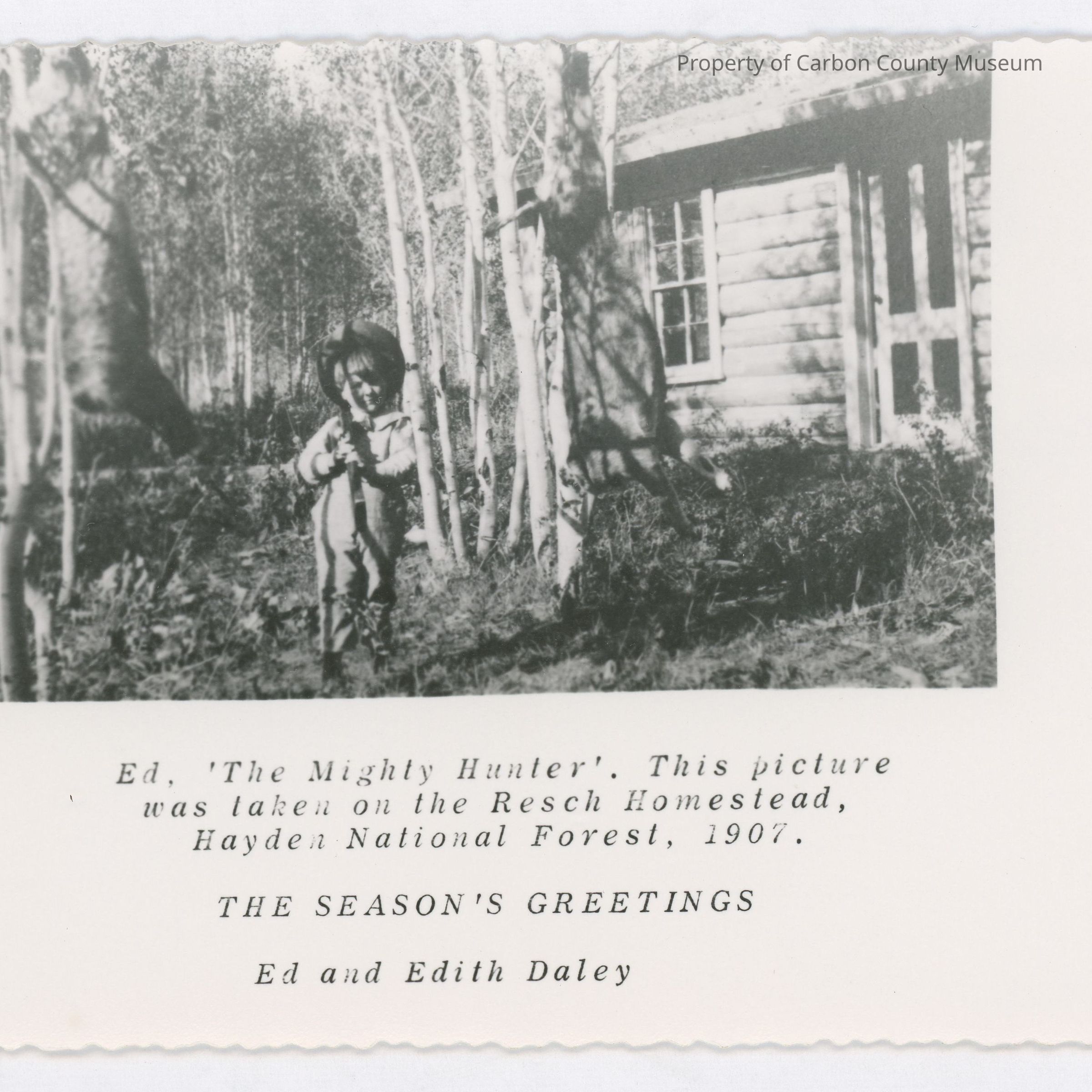 Printed below photo: "Ed, 'The Mighty Hunter! This picture was taken on the Resch Homestead, Hayden National Forest 1907." "The Season's Greetings" Ed and Edith Daley."