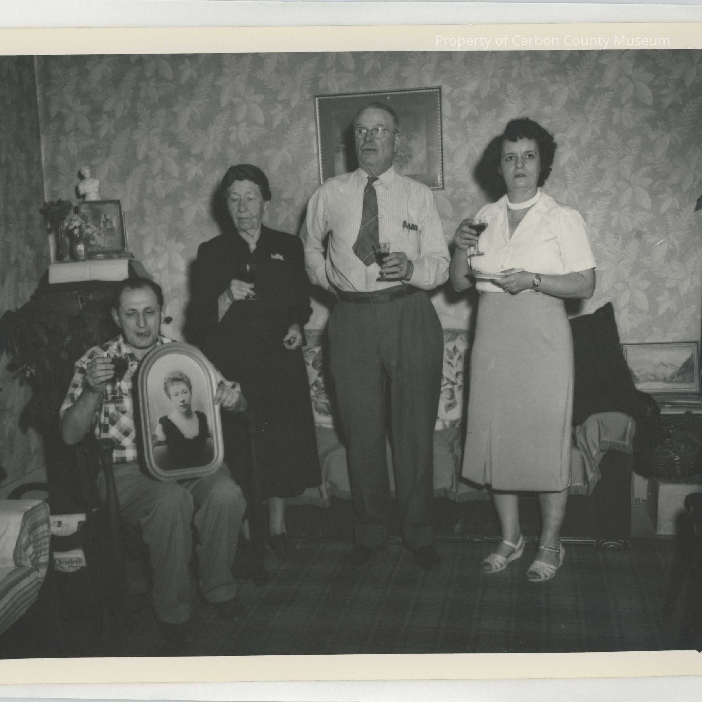 Update 2009: Black and white print of four people standing and sitting in a living room each with a glass of dark beverage in various sizes of goblets. Walls are decorated with leafy light patterned wall paper. Man on left wearing plaid shirt and dark trousers, is seated in a chair holding a framed studio portrait of Dr. Lillian Heath when she was young. Dr. Heath is standing next to this man . She is an older woman, and is wearing a black long sleeved dress and looking down at the young man. Lou Nelson is standing to her left. He is wearing dark trousers, white shirt and patterned tie. A picture is seen on the wall behind him. A woman dressed in a light mid calf skirt, white blouse, choker necklace and white sandals stands to his left. It appears they are preparing to make a "toast". Sofas have throw covers over them. A plaid rug covers the floor. Other decorative items are seen: photograph, small statue, painting, magazine rack, etc.