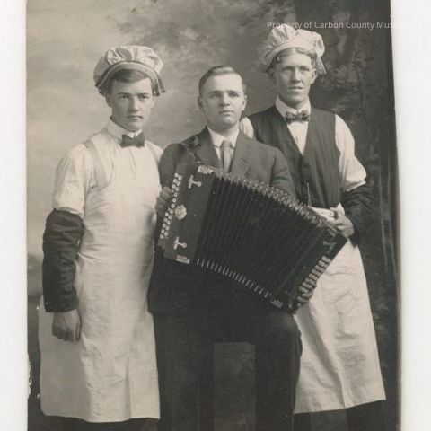 Update 2009: Black and white print. Printed on postcard paper. Photo of three men. The man on the left hand side is wearing a chef hat and a full apron. He is wearing dark slacks, a button up shirt and bolo tie. His right arm is covered with a black arm band. The man in the middle is wearing a dark suit with a tie. He is holding an accordion and has his left knee up. The man on the right is wearing dark slacks and vest. He is wearing a button up shirt with a bow tie. He is wearing a chef's hat and an apron on the lower half of his body. his left arm is covered with a black arm band.
