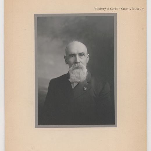 Update 2009: Black and white studio print attached to cream colored mat, lower left edge of mat has a small embossed Fleur de les icon. Embossed on corner side right is "The Ferris Studio, Rawlins, Wyo." Photo shows an older man wearing a dark jacket, light shirt, and white bow tie. He is bald headed and has long white chin whiskers and white mustache. A tiny elk pin is on his left lapel with letters BPOE on lower edge. A shadowy background is seen behind him. A tiny gray boarder surrounds print.