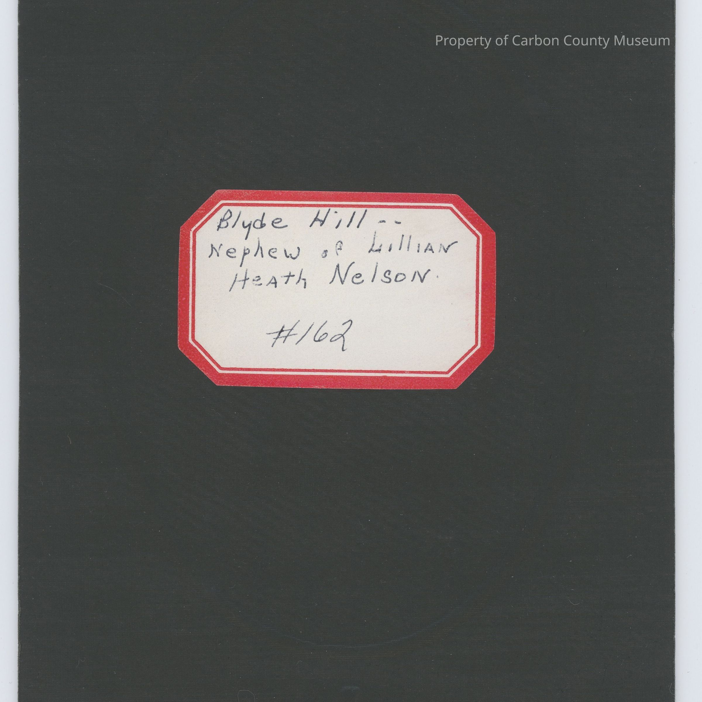 Written on red bordered white sticker on back in black ink: "Blyde Hill nephew of Lillian Heath Nelson."