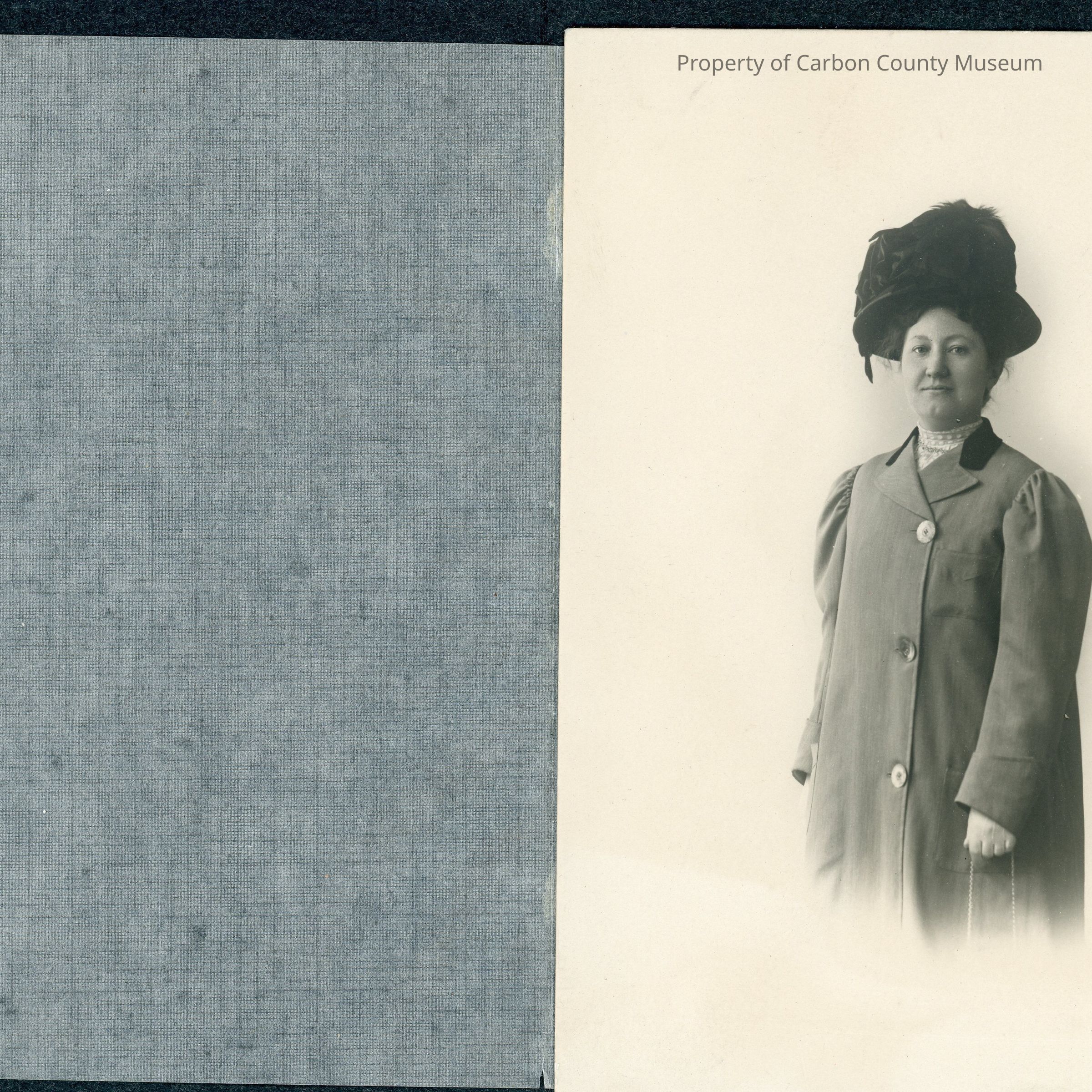 Update 2009: Black and white studio print encased in black mat folder with "The Bassell Studio 512 Sixteenth Studio, Denver, Colo" etched in front center of folder in white. A tissue, linen like paper is attached to print and print was attached to mat, but has come loose. Print shows woman dressed in long medium color, longsleeved dark back collar accent. A high necklace collar is seen in coat V. She has an ornate very hight large black hat on her updo hair, and her arms are hanging at her side.
