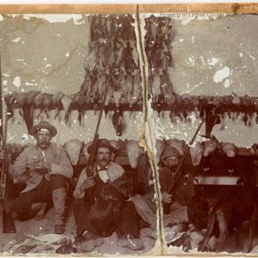Black & white print on tan mat. Image of three men seated on a wood floor in front of a bench. A dog is in the lap of the center man. They hold guns & wear heavy clothing. Surrounding them & hanging on the wall behind are dead ducks.Written on left edge: "Out on Sweetwater C. R. Watson"