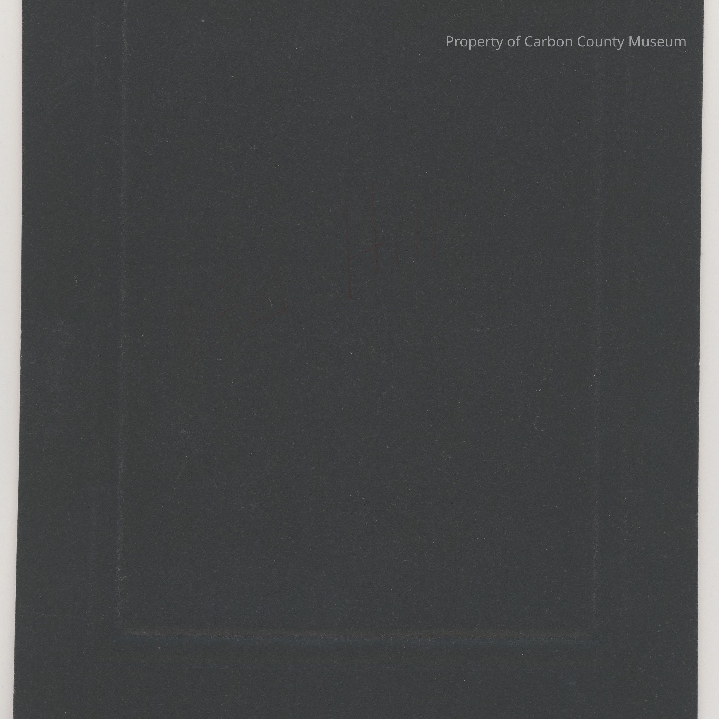 Update 2009: Black and white studio portrait print attached to black mat with tiny engraved parallel border around print. Print shows a very young light haired boy wearing a dark suit with a medium colored button shirt. The open jacket has a wide lace collar and lace cuffs. The pants appear to be knickers length. Studio props include a large boulder with a straw hat laying on it and furry grass on floor. Backdrop scenery behind the boy is of another boulder and trees. Young boy has his left arm resting on the boulder.