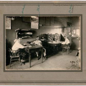 Black & white print on two toned grey mat. Image of an office interior & three men, one is seated at a desk & two at a table. On photo right is man at desk sitting in a curved backed chair, legs outstretched in front of him. Desk back has a hutch with many compartments that have papers in them. Other two men are seated across from each other at a library table with drawer. Man on left has both arms on the table & holds a cigarette in his left hand & has a pencil above his right ear. The calendars on the wall are on the month of May 1918. In right foreground is a wood stove(?). with a pipe & valve in front. In center right a telephone hangs from a metal, accordion style hanger. An adding machine with "Burroughs" on it is sitting on a stand next to the wall. A partition divides this office from the entry & a walk up window with boards on sides is on photo right. Written on top mat border above heads: "D. C. Justus", "J. E. Smith", Joe Jones, grandad".