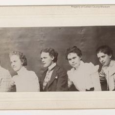 Update - 2009: Black & white print. Studio portrait. Mounted on off-white matboard with patterned edges. Portrait of four young women & a man posed in a row, looking to the viewers left. Painted backdrop behind. Women on each end are wearing light-colored plaid with large white bow at neck; women at 2nd right & left are in white; man at center is wearing dark jacket, white shirt & patterned tie. All women have their hair pinned up.