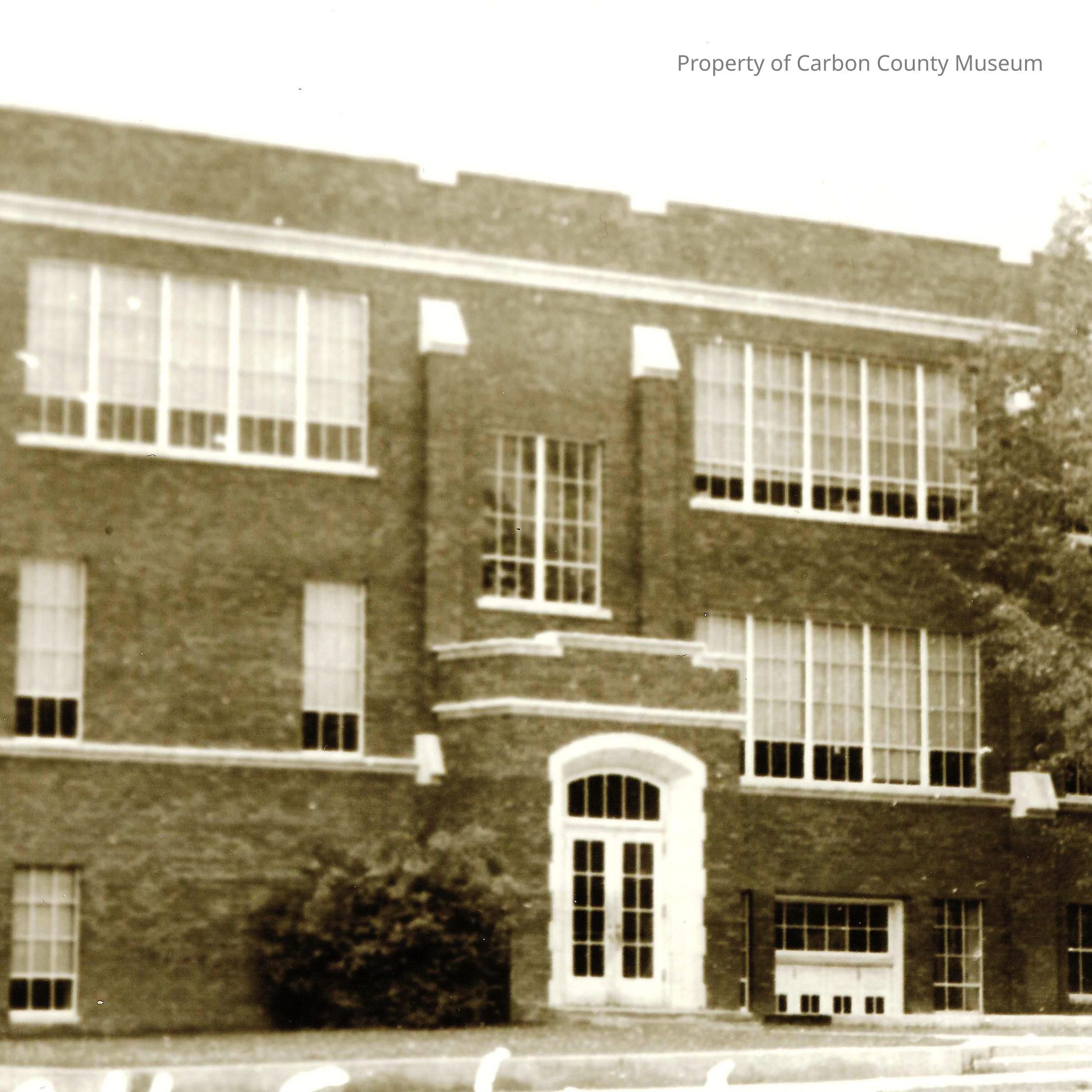 Black & white copy print. Image of a multi-level brick building with light colored, double doors. It has many windows that are trimmed in light color also. Large trees are at side & corner with a lawn & short concrete wall before reaching sidewalk & street. Building in 2020 is known as the Carbon Building and contains the Carbon County Library and various county offices.