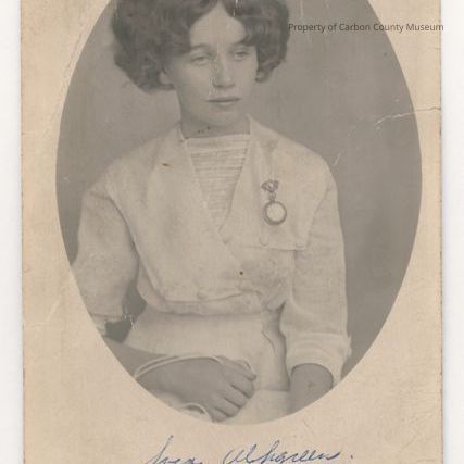 Update 2009:Black and white postcard. Young lady has on light colored dress, very wide irregular collar continuing down front of dress to a straight bottom with three cloth covered buttons on each side. Right side is shorter and has watch pin attached. Front inset on blouse has tucks. She is holding a white cord in her right hand. She has short brown full head of hair, parted in the middle, wavy curls fall just below ears. Oval picture on white background. Studio portrait. Written in ink on front below photo: OSvea? Alhgreen.