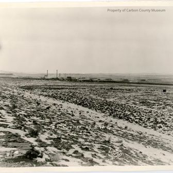 Black & white glossy print. Image of a complex of buildings, some with smoke stacks, others stream rising & a series of large tanks. They are beside the railroad tracks. Foreground of photo is low brush with snow drifted around brushes & some bare spots to create a mosaic pattern. A small building sitting alone is on photo right. Written on white on bottom on original negative: "SE. corner of S. W. 1/4 Sec. 22 Meyers Photo Rawlins"
