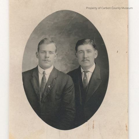 Update 2009: Black and white postcard half. Studio portrait oval photo on white background. Two well dressed men in dark suits, white shirts, and dark ties. Man on photo right has stripped tie with tie tack, mustache, dark hair parted on his left, combed flat. He has on a vest. Man on photo left has tie tack and lapel pin, lighter colored hair, mustache.