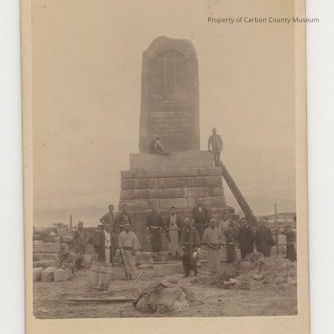 Update 2009: Black and white print attached to a cream colored mat with gilt on all edges. Print shows a massive monument attached to a high stone block base with a concrete base between the stone blacks and the solid monument. A man is seated on this concrete base in the front of the monument. Another man is standing on the top rung of a high ladder propped against the monument on side right. A group of oriental men are wearing kimonos with side sash around waits. (Only man on side left of print, man on ladder and man on monument are wearing trousers). In foreground is seen large stone blocks on ground, wooden barrel, piles of straw and mats and a straw hat on top of pile in center. A shovel is stuck upright in the ground in foreground center.