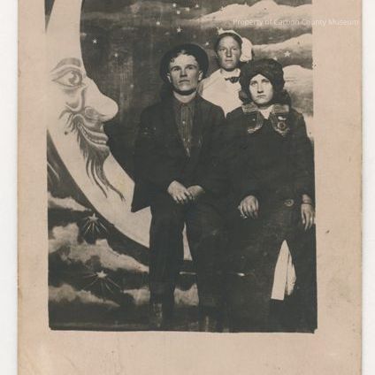 Update 2009: Black and white photo on white background. Irregular border, larger white area at bottom. Three people posed in front of moon and stars set. In the center there is a young lady standing. She has on white jacket, dark bow at neck, white hair band with bun on her left. Man seated in front on photo left has dark suit and shirt, dark boots, hat. Lady seated on photo right has dark hat, dark coat with plaid collar with broach on her left side collar. Coat is opened at bottom to show light colored dress.
