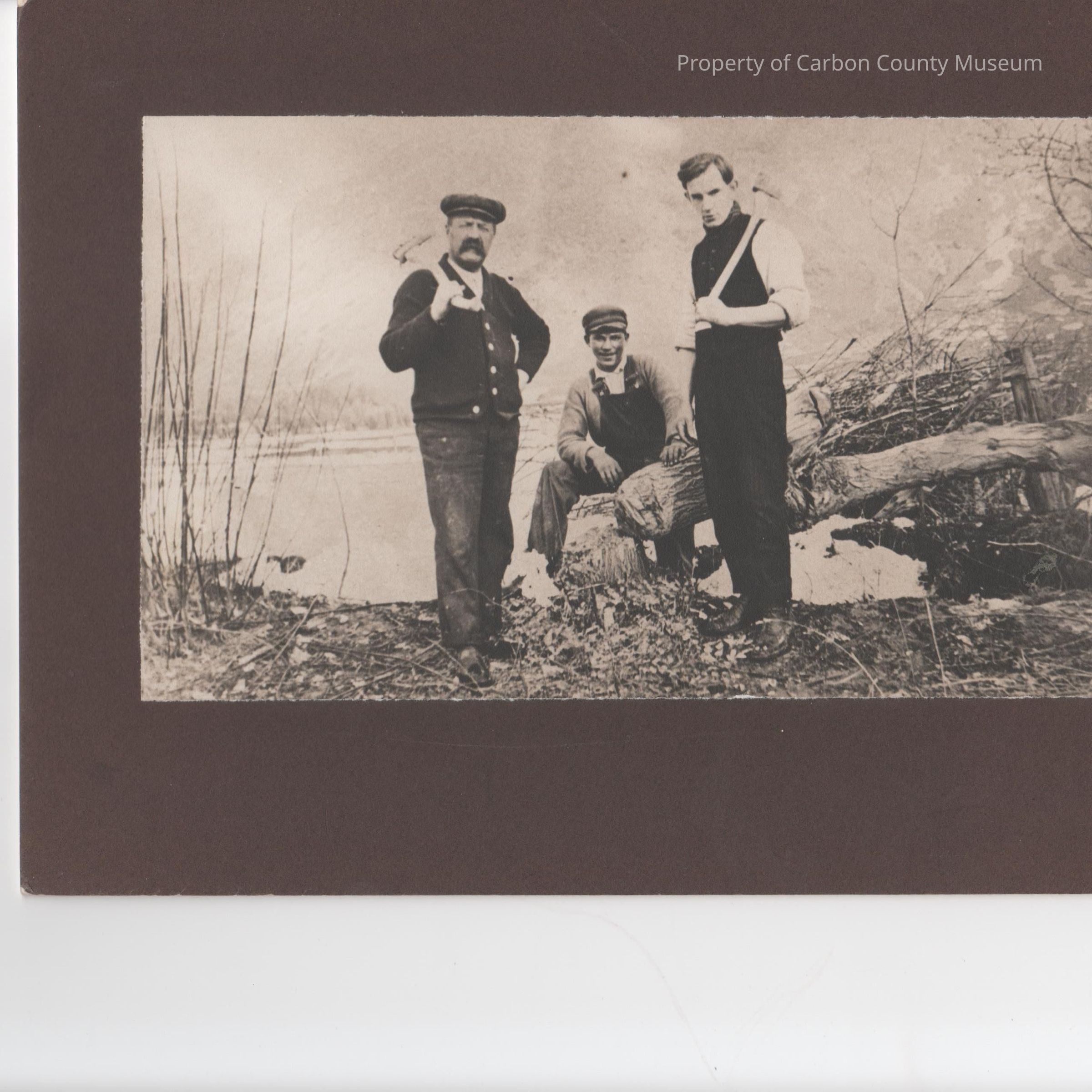 Sepia print on brown mat. Image of two men holding axes over their shoulders & a boy kneeling on the other side of a downed tree. The man on left is wearing a dark button down sweater over light colored shirt & dark pants. He wears a cap & has a full mustache. Man on right wears a dark vest, pants & light colored long sleeved shirt with sleeves rolled up. The boy wears bib overalls & a light colored sweater over a shirt. He has on a cap & his left hand is on the fallen tree & his right hand is on his knee. What appears to be snow is behind them & under the tree. A brush pile or possible beaver dam is behind them on photo right.