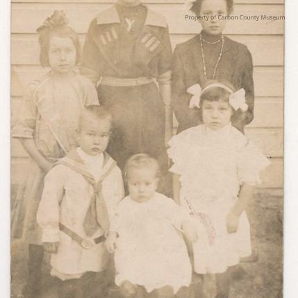 Update 2009: Black and white postcard. Six children. Back row has three girls standing. Girl on left has dark hair, light colored dress, dark shoes, bow in hair on top of head. Girl in middle is taller, has dark dress with light collar and belt and lighter applique strips with buttons, has on necklace, has dark hair with bow on her right side. Girl on right is in dark dress with stand up collar, has white bow in hair tied on her right wearing a long necklace with shorter loop around neck. Front row has three children. Young boy on left has on light colored shirt with medium colored scarf with light piping/sailor suit, dark shoes and socks. Middle is a very young child seated, light colored dress, dark shoes. Girl on right has light colored dress, dark shoes, dark hair with light band across top of hair and bows on both sides. Standing in front of wood sided building.