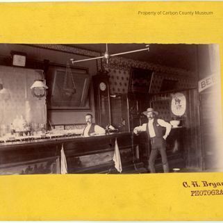 Black & white print on yellow mat. Image of interior of saloon with two men, one on each side of a bar. The bar has pictures painted on panels in front. Hanging beneath the bar are hooks on which towels are hung. Glasses line a shelf behind the bar & a window is tilted open on wall above. A grandfather clock is to photo right of the window. A wood cabinet is next to clock, it has a faucet & lever on the side & the doors on the front look like ice box latches. Several lamps are hanging above the bar. The man behind the bar has short hair, mustache & wears a dark vest over a white, long sleeve shirt. The man in front wears dark slacks, vest, a white shirt & wide, flat brimmed hat. He has a watch chain & fob & rests his right elbow on the bar with his left on his hip. Engraved on lower right corner: "C. H. Bryant & Co., Photographers"