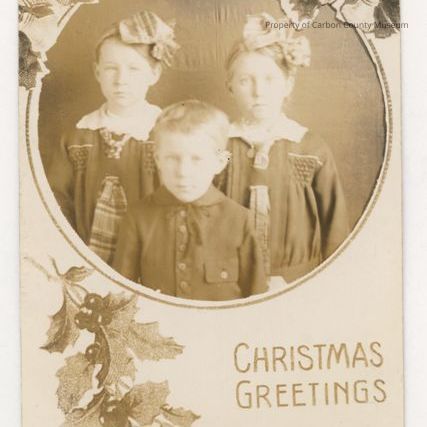 Update 2009: Black and white postcard. Photo of three children (faded sepia). Two girls standing in back dressed in sailor looking dresses, dark dresses with white collars and front plaid ties looped through dress, scalloped puckers on front next to sleeves of dress. Both girls have large plaid bows in their hair. Hair pulled back and up. Young boy in front of girls dressed in dark shirt buttoned up to neck, matching button on pocket of shirt. String tie at neck. Round photo of children with "Christmas Greetings" printed on lower right on original negative. Decorated with holly leaves and berries and bells on top left and right and lower left of photo.