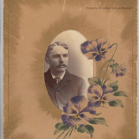 Update - 2009: Black & white print. Studio portrait. Mounted in a hand painted & cardboard frame with purple pansies on lower right edge of oval opening & gold splashes around opening & outer edges. Scalloped edge on frame front. Head & shoulders portrait of a man in a dark jacket, dark patterned tie & white shirt. he has short hair & mustache. A stickpin in the shape of a hand & forearm in tie.