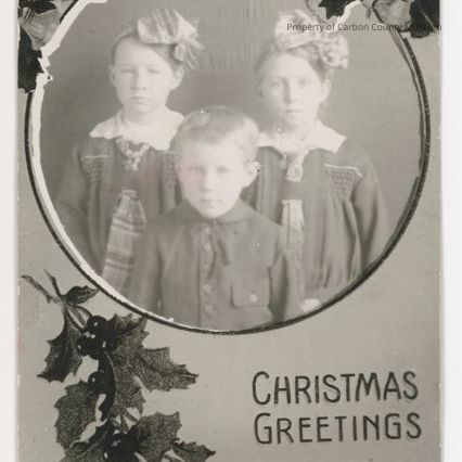 Update 2009: Black and white photo, postcard (faded grey). Same as 1954.225.0080. Photo of three children (faded sepia). Two girls standing in back dressed in sailor looking dresses, dark dresses with white collars and front plaid ties looped through dress, scalloped puckers on front next to sleeves of dress. Both girls have large plaid bows in their hair. Hair pulled back and up. Young boy in front of girls dressed in dark shirt buttoned up to neck, matching button on pocket of shirt. String tie at neck. Round photo of children with "Christmas Greetings" printed on lower right on original negative. Decorated with holly leaves and berries and bells on top left and right and lower left of photo.