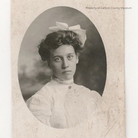 Update 2009: Half of black and white postcard photo of young woman. She is wearing a light colored dress with a high collar. has necklace around collar. Has pin or button beneath necklace. Eyelet decoration on front of dress, poofy sleeves. She has hair pulled up in soft curls and tied with a large, light colored bow. Photo in oval shape with white background. Left front has been cut off.