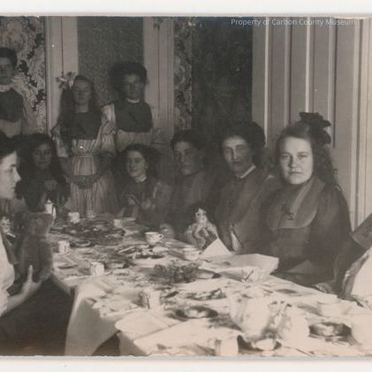 Update 2009: Black and white postcard print of a group of young people seated and standing around a table. Table is set with cups and teapots. There is one boy and three girls seated at table in background, one girl on left of photo and one at far end of the table. There is one boy and three girls standing against the wall in background. Girl second from right is holding a doll. Boy third from right is holding a stuffed monkey. Girl on other side of table holding a stuffed bear and a porcelain doll. Girl seated at the end of the table is holding a stuffed animal. All young people are wearing a bib with the letters "RHS" on the front. Wall in background has large print wallpaper. Girls are in dresses, several with large bows in their hair.
