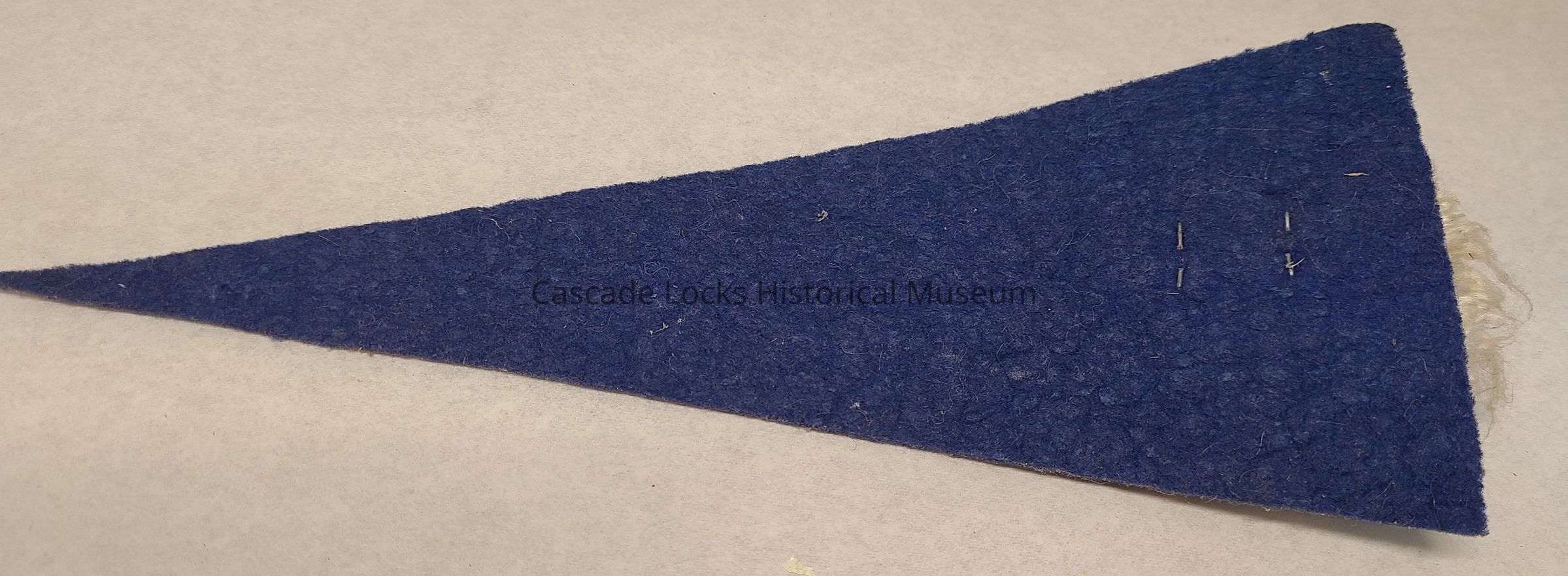 Pennant tapered flag. Flag is blue and white with white font and white pom. Pennant flag is small in size compared to the average size of a pennant.