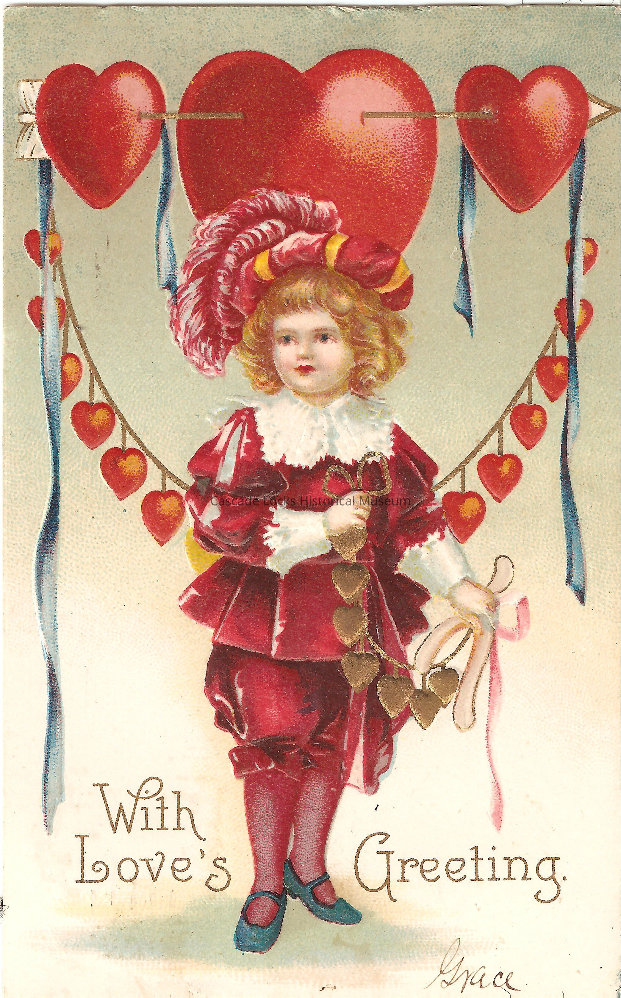 Post Card, illustrated image of a young child dressed ornately in a coat, breeches, stockings, high heels, collar, and hat with feathers holding a string of gold hearts. Base of card reads, "With Love's Greeting. (signed) Grace."