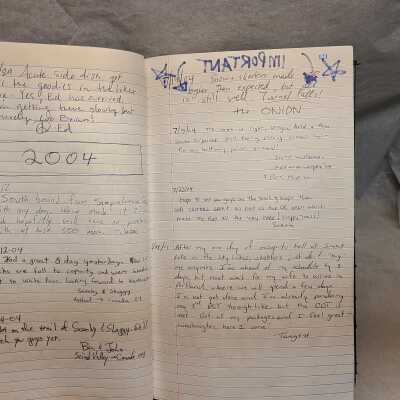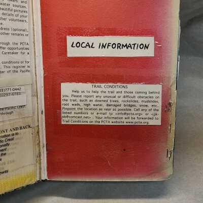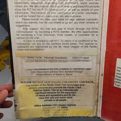 Pages are lined notebook paper that people hiking the PCT would sign and write inscriptions from August 16, 2000 to Oct 4, 2021.Transcription