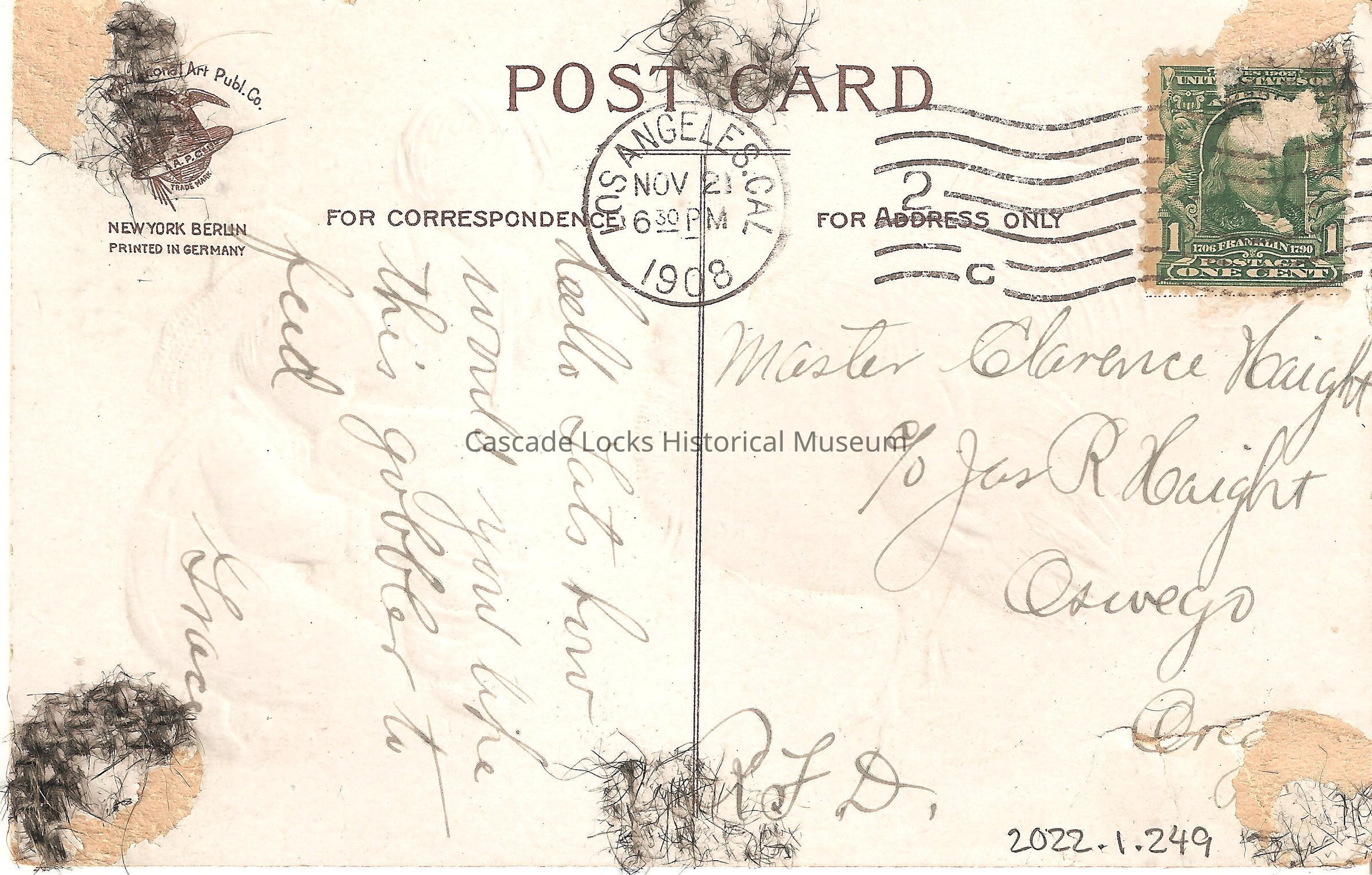 Back of image reads, "Post Card, For correspondence, Reelo lats how would you like this gobbler to feed -Grace. RFD. For Address Only- Master Clarence Haight c/o James R. Haight Oswego, Oreg. 1908. United States of America 1706-1790 Franklin, Postage One Cent (Stamp). Los Angeles Cal, 1908. Nov 21 630-PM, Art Publ. Co. Trade Mark. New York Berlin Printed in Germany."Lexicon